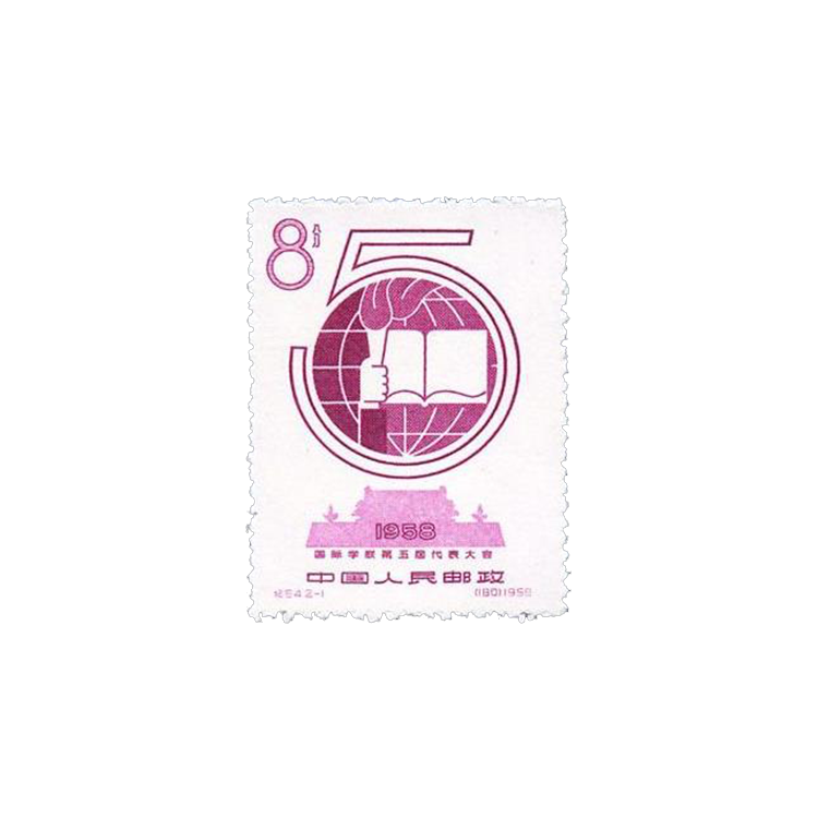 国际学联的全称是国际学生联合会,成立于1946年。1958年9月4日至15日,国际学联第五届代表大会在我国首都北京召开。本届大会主要讨论了国际学生运动的发展,以及国际学联和学生组织对保卫学生利益和促进学生合作的贡献等问题。邮票下方绘有淡淡的天安门剪影,并有“1958”及上部的阿拉伯数字“5”字样,表明了会议召开的时间、地点及届数。而主图则为国际学联的会徽,其图案为一手高举着熊熊燃烧的火炬,照亮了一本打开在地球上的书,完美地体现了国际学联致力于维护世界和平和争取民主教育的宗旨。