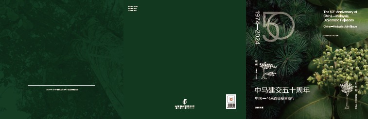 插套和封面图案左侧为代表中国的松树,表现松针;图案右侧为代表马来西亚的印茄树,表现印茄花叶。左上角为数字“50”,纪念中马建交50周年。插套整体色彩为金色,寓意两国友谊情比金坚。封面和内页色彩为绿色,既表现了树木的颜色,也寓意两国共同生机勃勃地发展。