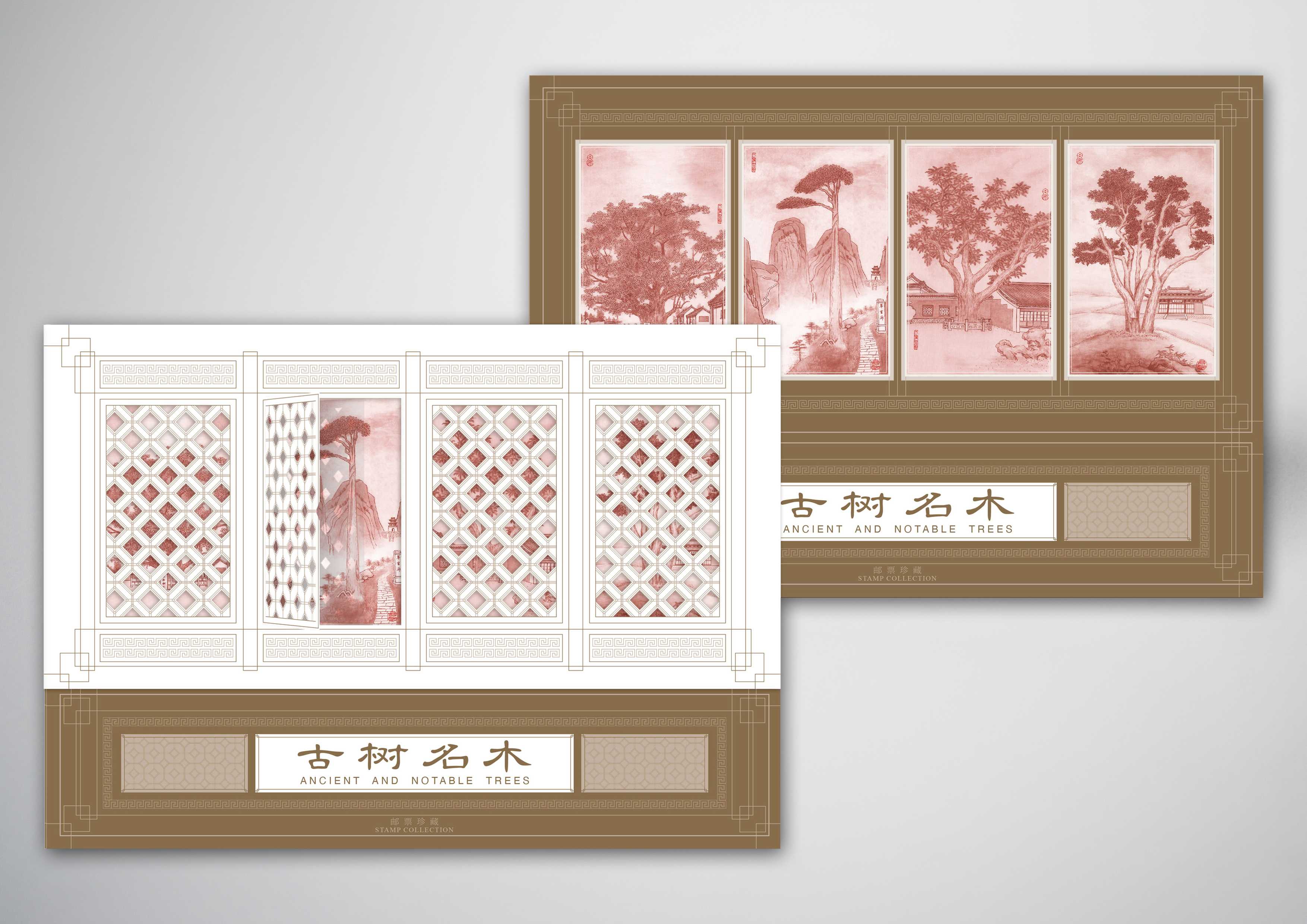 《古树名木》四方连邮折插套选用了窗棱的设计体现隔窗观景的意境,建立起古树名木与人文精神的联系。采用镂空工艺,可实现富有互动感的个性化开窗,提升观赏的趣味性。封面设计理念源自中国四扇屏这一传统的艺术形式,由四幅相互关联的屏条组成,插画由中国画家马飞达老师精心创作。