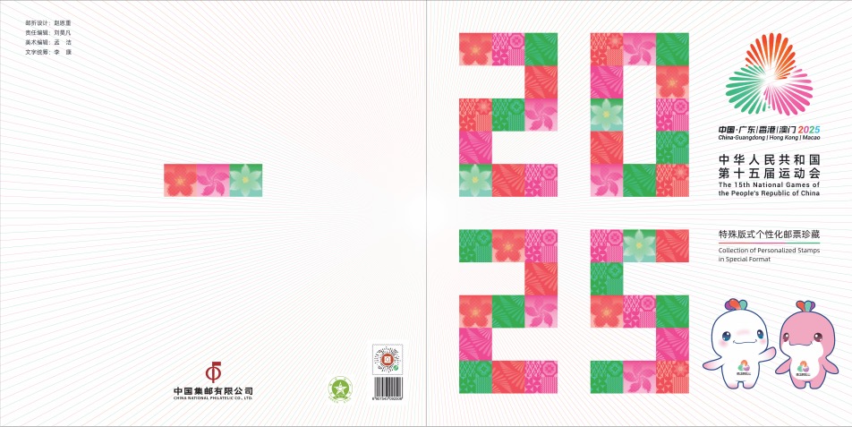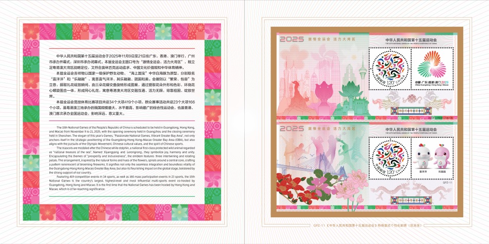 中国集邮有限公司于2025年9月15日发行《相约粤港澳》中华人民共和国第十五届运动会特殊版式个性化邮折。内含两枚版体育主图特殊版式个性化邮票。
