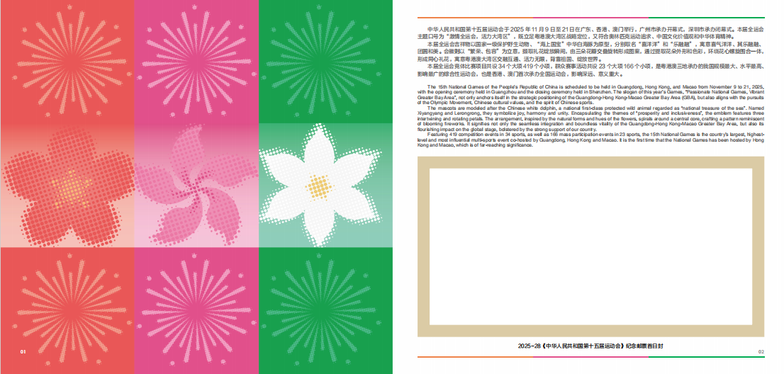 中国集邮有限公司于2025年11月9日发行《中华人民共和国第十五届运动会》整版卡书。内插新邮版式一、版式二、首日封。