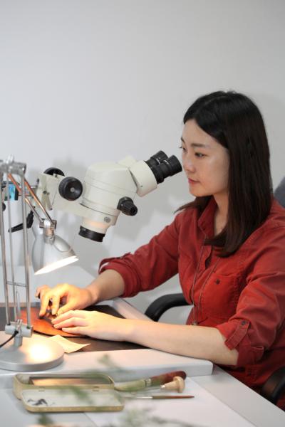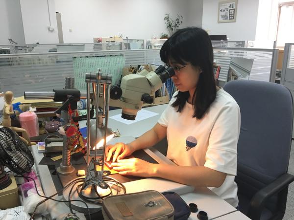 在创作雕刻线条时,通过观察和研究发现原稿的仕女图眉眼有些西方化,创作时,翻阅了大量的仕女画作,参考并借鉴了中国传统白描中的仕女形象,通过把过于直的眉刻画的略弯、适当加长了仕女的睫毛等方法,在不破坏原稿的整体感的情况下,符合东方传统大众审美的标准。