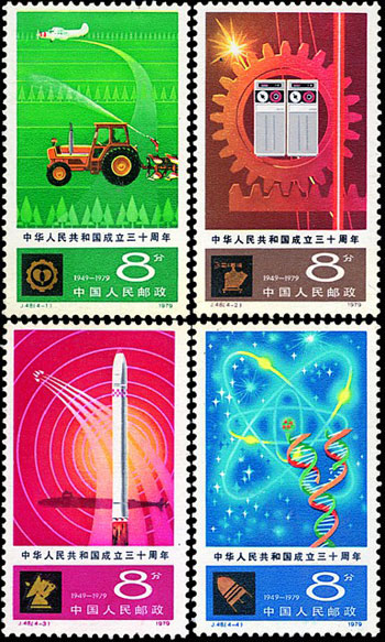 这套邮票属于第五组中华人民共和国成立30周年纪念邮票,一套4枚,分别从农业、工业以及国防现代化和科技技术现代化事业方面展现了我国建国30周年的发展状况。该套邮票由薛世哲设计,于1979年10月1日发行。