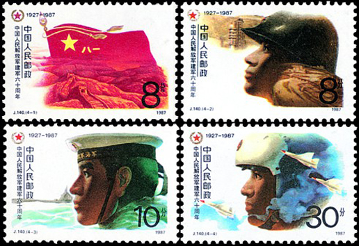 1987年8月1日,在中国人民解放军建军60周年之际,邮电部发行了这套以三军士兵形象为图案的纪念邮票,全套4枚。内容分别为:“军魂”画面为在长城和高山的村托下,高高飘扬的中国人民解放军“八一”军旗。“陆军战士”主图是陆军战士头像,背景为祖国的锦绣河山及导弹发射基地。“海军战士”主图是海军战士头像,背景为浮出水面的潜水艇。“空军战士”主图是空军战士头像,背景为新型战斗机。每枚邮票的左上角都有中国人民解放军“八一”军徽。该套邮票由刘向平设计。