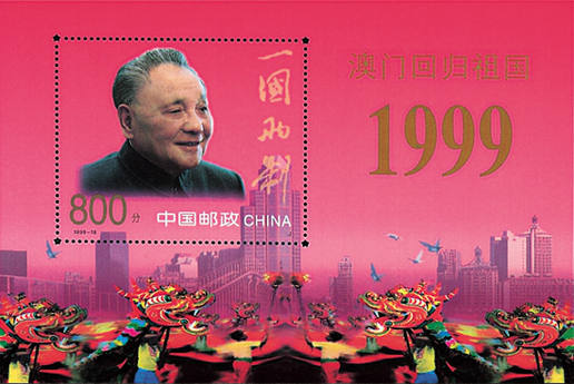 1999年12月20日,为了纪念澳门回归祖国,国家邮政局发行了《澳门回归祖国》纪念邮票一套2枚。邮票第一枚为“中葡联合声明”,画面以《中葡联合声明》为中心,左下角饰以荷花衬托。第二枚为“澳门基本法”,画面以《澳门基本法》为中心,下部饰以长城图案。该套邮票由杨文清、张桂林设计,于1999年12月20日发行。