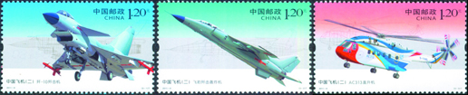 2011年4月17日,新中国航空工业创建60周年之际,中国邮政发行《中国飞机(二)》特种邮票1套3枚,邮票内容分别为“歼-10歼击机”、“飞豹歼击轰炸机”、“AC313直升机”。该套邮票由方军、孟庆晨设计。