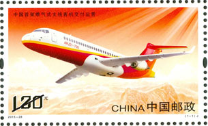 中国首架喷气式支线客机ARJ21-700飞机于2015年11月28日交付成都航空公司。ARJ21新支线飞机是我国首次按照国际适航标准自主研制的新型涡扇喷气支线飞机,ARJ21新支线飞机的交付运营,标志着中国民机产业实现了历史性突破。该套邮票设计选取飞机侧前方飞行的视角,完整展示了飞机的优美动感外形。背景以蜿蜒起伏的长城和群山,增强了画面的空间感。邮票整体的红色调与机身涂装颜色相协调,结合光线效果,喻示了我国飞机制造业的光明前景与美好未来。该套邮票由史渊设计。