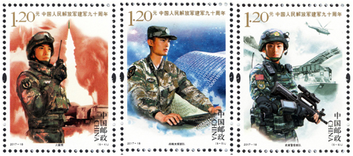 2017年8月1日,中国邮政发行《中国人民解放军建军九十周年》纪念邮票一套6枚,小型张1枚。图案内容分别为:陆军、海军、空军、火箭军、战略支援部队、武装警察部队,小型张内容为听党指挥。该套邮票展现了中国人民解放军的飒爽英姿和中国军事作战装备的硬件实力,主题鲜明,磅礴大气,画面具有强烈的动感和威严的气势。小型张上军旗飘扬,各军种英姿飒爽,背景衬托各军种高尖端装备,描绘了我军战士联合作战的画面,既表现了中国人民解放军威武雄壮的军容和现代化水平,也表现了在党的指挥下,人民军队忠实履行保卫祖国、捍卫和平的神圣使命。该套邮票的设计者为李翔、李晨、仓亭亭、刘伟、沈璐。