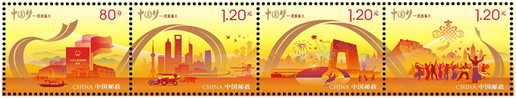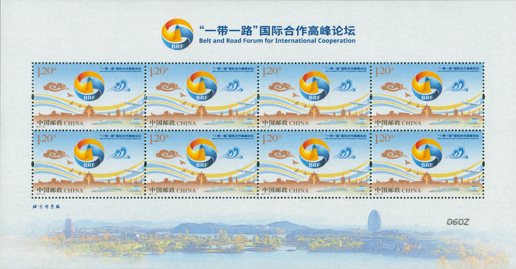 “一带一路”国际合作高峰论坛于2017年5月14日至15日在中国北京举办。中国邮政在论坛开幕当天发行《“一带一路”国际合作高峰论坛》纪念邮票一套1枚,邮票以论坛标识为主体,画面中水纹元素代表了财富和海上丝路,祥云代表了路上丝绸之路,体现了水利万物和包容、圆融的思想。邮票下方的城市剪影结合了古代文明遗址与现代建筑,反映了全国各地积极响应国家“一带一路”战略,体现了中国愿与沿线国家一道,携手共建“一带一路”,从而实现和平、发展与繁荣的共同愿景。该套邮票由董琪设计。
