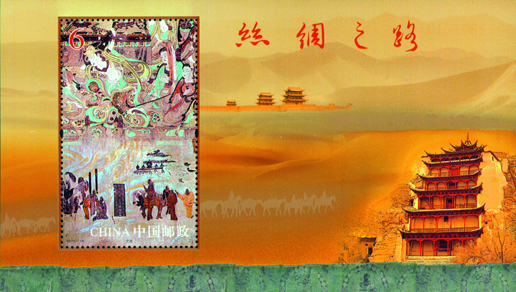 2012年8月1日,中国邮政发行《丝绸之路》特种邮票一套4枚,小型张1枚。邮票内容分别为千年帝京、大漠雄关、神秘故国、西域胜境,小型张内容为交流。该套邮票由陈景异、惠斌、李群设汁。