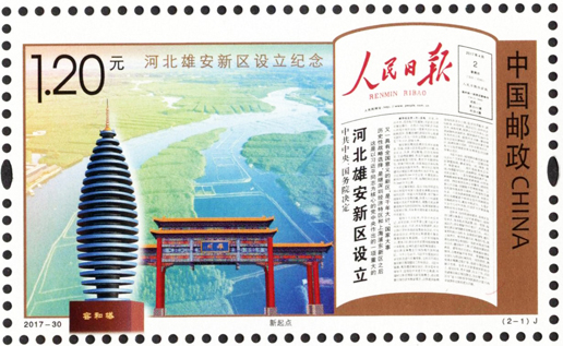 2017年12月22日,中国邮政发行《河北雄安新区设立纪念》纪念邮票1套2枚。图案内容分别为:新起点、新使命。该套邮票犹如徐徐展开的画卷,昭示着在以习近平同志为核心的党中央坚强领导下,雄安新区发展的美好前景。该套邮票设计者为武世宁。