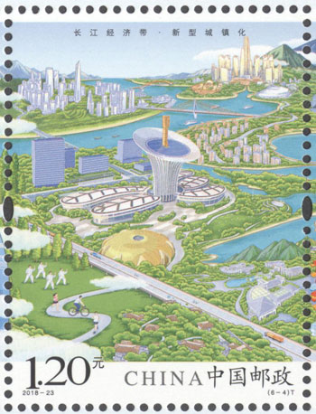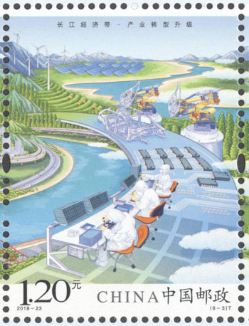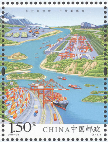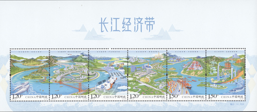 2018年8月26日,中国邮政发行《长江经济带》特种邮票1套6枚,小全张1枚。邮票图案名称分别为:共抓大保护、综合立体交通走廊、产业转型升级、新型城镇化、开放新格局、区域协调发展。邮票以手绘方式生动展示了长江经济带全方位的发展成就。第一图描绘了长江经济带共抓大保护的发展理念和美丽的自然生态。第二图展现了长江经济带科学高效的综合立体交通走廊。第三图展示了长江经济带产业转型升级,加速培育新动能。第四图描绘了长江经济带以人为本的新型城镇化。第五图展现了长江经济带的开放新格局。第六图描绘了长江经济带的区域协调发展。邮票设计者为邹庆。