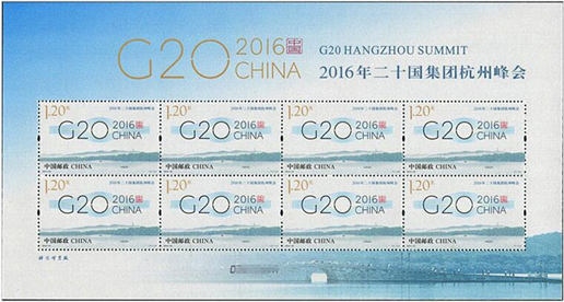 二十国集团(G20)领导人第十一次峰会于2016年9月4日至5日在浙江省杭州市举办,这是中国首次主办二十国集团峰会。中国邮政于2016年8月27日发行《2016年二十国集团杭州峰会》纪念邮票1套1枚,杭州峰会会标图案由20根线条勾勒出一个桥形轮廓,寓意二十国集团已成为全球经济增长之桥、国际社会合作之桥、面向未来的共赢之桥。该套邮票由何洁、孟梦设计。