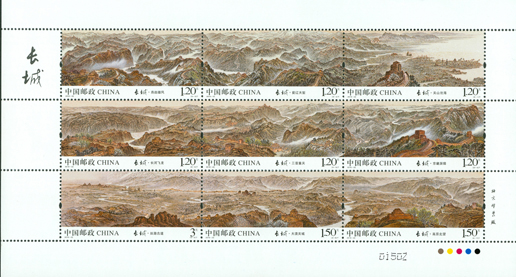 中国邮政于2016年8月20日发行《长城》特种邮票1套9枚,图案内容分别为: 关山沧海、蓟辽天堑、燕赵雄风、京畿屏障、三晋重关、长河飞龙、高原北望、大漠关城、丝路古道。该套邮票以九图连票的形式全景展现了明代长城沿线的自然风貌和人文景观,局部细腻严谨、整体大气磅礴,表现了长城气势之雄伟、历史之悠久。该套邮票由著名画家许仁龙、张济平共同设计。