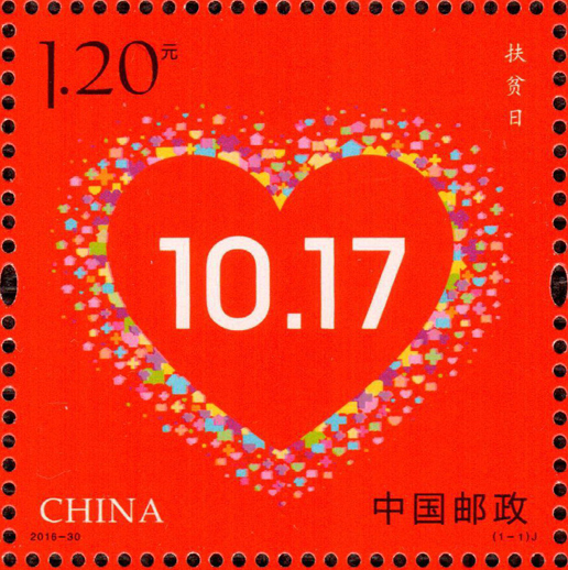 2016年10月17日是我国的第3个扶贫日,中国邮政发行《扶贫日》纪念邮票一套1枚。邮票设计以国旗红为底色,将衣、食、住、医、学等符号组合成心形——寓意两不愁(不愁吃、不愁穿)、三保障(义务教育、基本医疗、住房),中间为扶贫日的日期10.17。整个设计寓意深刻,表达了全社会对扶贫工作的高度重视和积极参与。该套邮票由何洁、周岳设计。