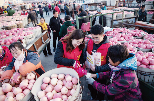今年四季度,栖霞分公司组建了一支由机关各职能部门、专业部室共产党员和入党积极分子组成的党员突击队。20余名队员身着“党员志愿者”红马甲,活跃在当地苹果收购市场上,在严冬为果农送上热水、热豆浆、热鸡蛋、劳保手套,帮助果农抬苹果、搬筐子,提醒果农防范金融诈骗、将苹果款及时存到正规银行。这一暖心举动得到了广大果农的认可和赞誉,拉近了邮政与人民群众的距离,让果农切实感受到“人民邮政为人民”的贴心服务。