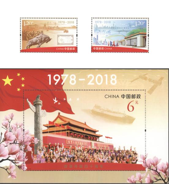 中国邮政报(记者 王楚芸) 为庆祝改革开放40周年,中国邮政于12月18日发行《改革开放四十周年》纪念邮票一套2枚、小型张1枚。邮票图案名称分别为“高举旗帜”和“伟大实践”,小型张图案名称为“筑梦新时代”。