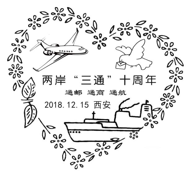 12月15日是《两岸“三通”十周年》邮票发行日,配合邮票的发行,西安市邮政分公司将启用1枚纪念邮戳。