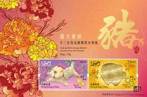 2019年1月12日发行贺岁生肖邮票第四辑的第八套邮票——《岁次己亥(猪年)》,全套4枚邮票分别以刺绣、木雕、陶瓷及玉雕工艺品,展现宝猪圆润富泰、可爱善良的形象,瑞意呈祥。另推出邮票小型张和丝绸邮票小型张,为新春佳节增添吉庆气氛,迎春接福。同日还将发行十二生肖金银邮票小型张《灵犬宝猪》1枚(图1);银箔烫压生肖邮票——《猴、鸡、狗、猪》小全张1枚,其内的猴、鸡、狗、猪邮票采用2016年至2019年生肖邮票的设计。