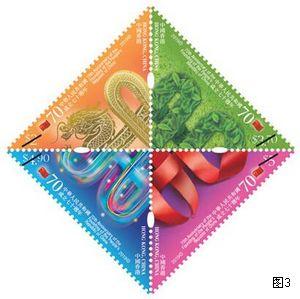 2019年10月1日发行《中华人民共和国成立70周年》1套4枚纪念邮票(图3)。1套4枚邮票以如意结作为设计亮点,构图精巧细腻,寓意我国在社会、环境、科技及经济多方面取得卓越发展与成就。