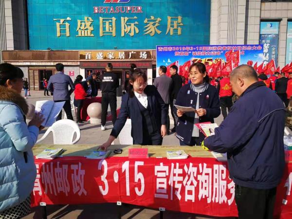 3.15前,我省各地邮政分公司积极开展宣传咨询服务活动,受到广大群众欢迎。