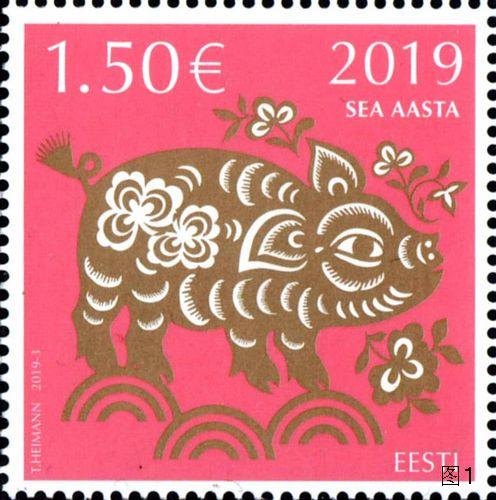 爱沙尼亚发行《2019中国新年--猪年》邮票(图1)一套1枚,编号2019-3,由AS·瓦巴玛(AS Vaba Maa)公司采用彩色、胶版工艺印制,面值1.50欧元,图案为一只具有装饰艺术风格的剪纸猪,设计者特里恩·海曼(Triin Heimann)。该邮票是爱沙尼亚邮政推出的“中国新年”系列邮票的第9套。其首套邮票于2011年2月3日发行,票名《2011中国新年--兔年》,全套1枚。