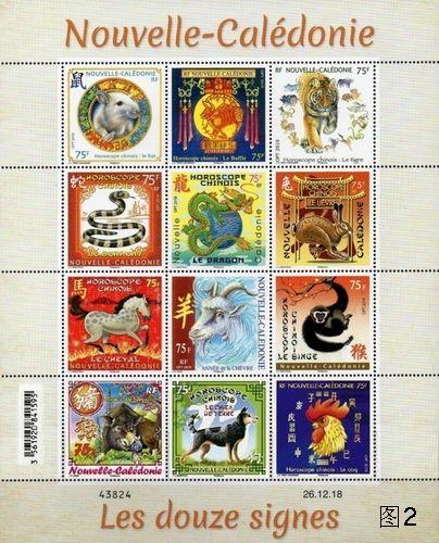 新喀里多尼亚发行《中国十二生肖》小版张(图2)1枚,采用彩色、胶版工艺印制,内所含的12枚邮票以3×4型制排列,面值均为75太平洋法郎,其中的“生肖猪”以野猪作图案。