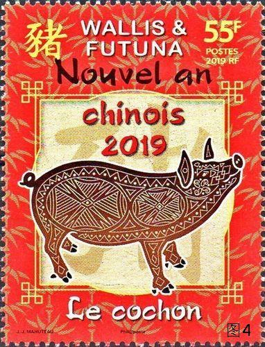 法属瓦利斯和富图纳群岛发行《2019中国农历猪年》纪念邮票一套1枚(图4),彩色、胶版印刷,面值55太平洋法郎,图案为装饰猪和竹。其全张票内含10枚邮票,以5×2型制排列,边纸上印有“十二生肖”图案。