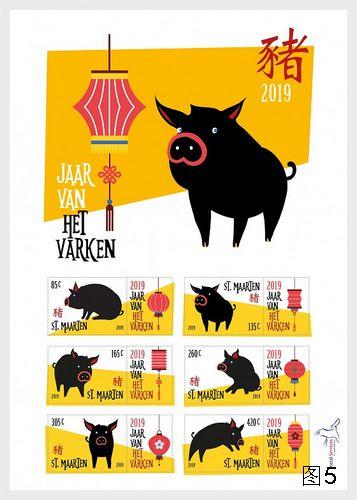 位于小安的列斯群岛北部、分属法国和荷兰的圣马丁岛,推出1枚名为《2019猪年》的小全张(图5),不干胶材质,由荷属安的列斯中心邮政发行。该小全张内含6枚带有副票的邮票,面值分别为85、135、165、260、305、420荷属安的列斯群岛分。主票以6只姿态各异的粉鼻、红耳小黑猪作主图,票面书有宋体中文“豬”(现时常用的“猪”为“豬”的异体字)及“2019”等字样。副票主图呈现了6个不同造型的灯笼,票面左侧印制“2019”及荷兰语“JAAR VAN HET VARKEN”(意为“猪年”),共同点明了邮票的主题。