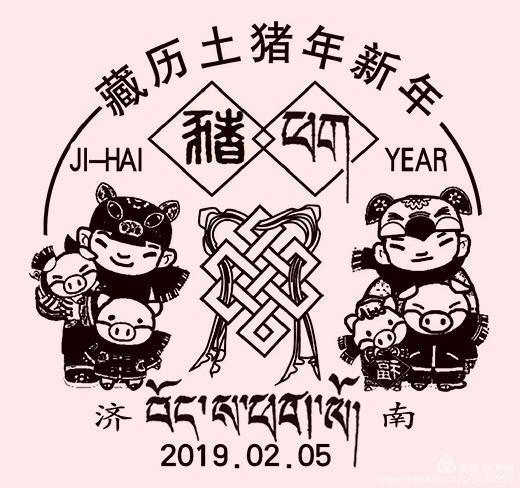 2月5日,己亥年农历正月初一,恰逢藏历土猪年新年。山东济南邮政启用“藏历土猪年新年”纪念邮戳1枚,图案由头戴猪帽、分别怀抱两只小猪的“欢欢”“喜喜”和汉印“猪”字等相关纪念文字组成。