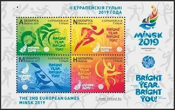 2月1日,白俄罗斯邮政发行《2019年明斯克第2届欧洲运动会》无面值(票面印有表示邮资类别的字母A、N、M与H)纪念邮票1套4枚及小全张1枚(见图)。邮票以小版张的形式推出,图案表现的是4个背衬植物的比赛项目,分别为自行车、田径、皮划艇与艺术体操,票面印有本届欧运会的会徽与口号;小全张内含邮票为四方连印,边纸图案为比赛项目图标及本届欧运会的会徽与口号;小版张内含单图邮票4枚,边纸图案为本届欧运会的会徽及比赛项目图标;配发有首日封1枚。