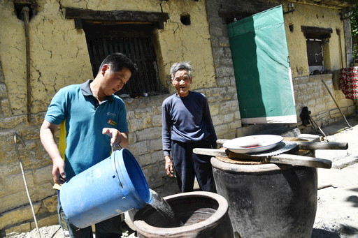 在董如德老人家里,孙吉刚掀起身旁的水缸盖子看了看,发现缸里的水已经不多,自然地提起一旁的水桶,到附近水井里提了两桶水上来。