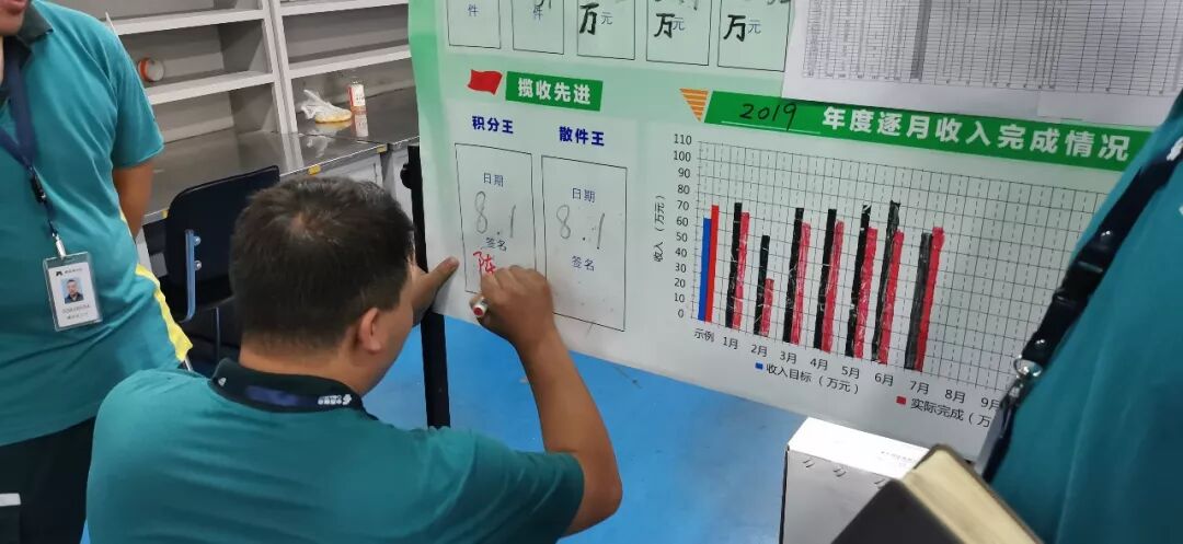 “8月1日,散户88件,协议2387件,月度收入完成率5%,年度新增客户54户……”晨会前,白龙江营投部经理胡北京更新了“营投部业绩管理看板”上的每日量收、月度收入、客户开发、揽收先进和学习园地等模块数据和内容。