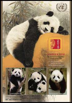 联合国邮政于7月31日为此次新加坡亚洲国际邮展发行纪念小型张1套1枚(见图),内含3枚相连邮票,在法国卡特厂以胶版印制,除边纸图案换用中国画家王申勇的另一幅表现大熊猫的画作及将邮展徽志改为新加坡亚洲国际邮展的徽志外,其余与联合国邮政于6月11日为中国2019世界邮展发行的纪念小型张相同,作为联合国推广可持续发展目标的动物亲善大使,双胞胎大熊猫启启和点点再次亮相联合国方寸。