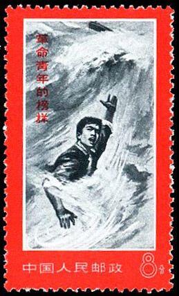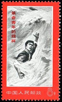 1970.1.21。影写版。P11.5。31mm×52mm。50(10×5)。[G]。 [A]陈逸飞、徐纯中。 [D]夏中东。 北京邮票厂。印1000万枚。 『文19发行背景』 金训华是“文化大革命”期间一位到东北农村插队的知识青年,在1969年的一次特大洪水中,他为打捞被洪水卷走的电线杆而牺牲。新闻界对此进行了大量报道。 有2种版式,俗称“白水版”和“黑水版”。(左图为“白水版”、右图为“黑水版”)