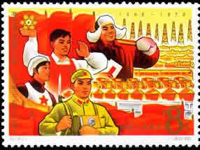 第一枚“工业建设”,描绘了大庆石油工人形象,还有手托原子模型的科技工作者,纺织女工和解放军战士,表现了中国工人阶级高举毛泽东思想伟大红旗,为实现“三五”计划而奋斗的决心。