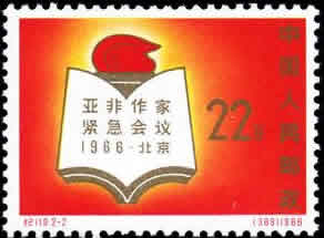 1966年的“5·16通知”是“文革”全面发动的标志。为同年“6·27”在北京召开的“亚非作家紧急会议”而发行的“纪119”从时间上划分,当是“文革”的第一套邮票。这个会议与“文革”并无关系,但两枚邮票通红的底色与中国大地上正在呼啸而来的“红海洋”是无法截然区分而开的。会议是紧急召开的,邮票的选题自然是临时安排的,邮票的设计采用了现成雕塑与证章,可见时间的紧迫。
