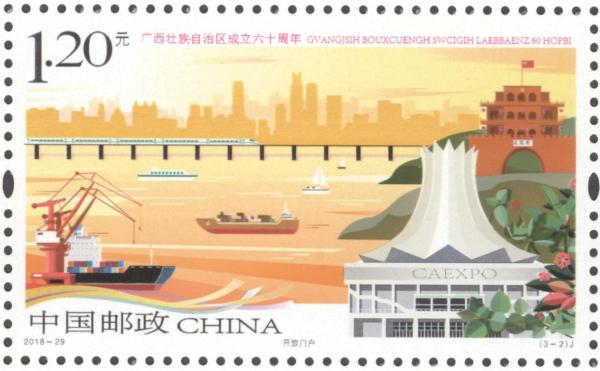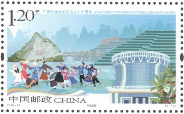 P.S. 2018年是广西壮族自治区成立六十周年。邮票采用电脑手绘的创作方法。第一图前景以广西民族博物馆主楼为主体,广西12个世居民族同胞身着传统服饰载歌载舞,欢庆自治区成立六十周年,中景为花山岩画、风雨桥和龙脊梯田,远景为壮族干栏式建筑和起伏的山峦,画面构图错落有致、色彩明快和谐,营造出自治区大庆热烈喜庆的氛围;第二图前景表现了南宁国际会展中心、船舶及塔吊,中景为奔驰的高铁列车和友谊关,远景为南宁东盟商务区建筑群,展现出广西经济社会发展的新成就;第三图前景为桂林象鼻山,中景为巴马命河,远景为层峦起伏的喀斯特地貌山峰,描绘出广西山清水秀的生态美景。