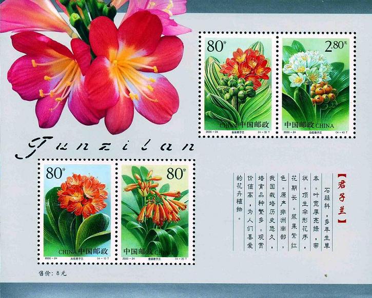 国家邮政局2000年12月12日发行《君子兰》特种邮票1套4枚,小全张1枚。