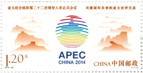 2014年纪念邮票《亚太经合组织第22次领导人非正式会议》中国邮政2014年11月10日发行《亚太经合组织第二十二次领导人非正式会议》纪念邮票1套1枚。