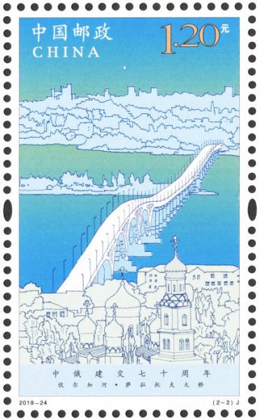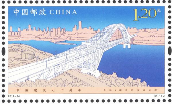 今年是中华人民共和国与俄罗斯联邦建交70周年,中国邮政定于2019年10月2日发行《中俄建交七十周年》纪念邮票1套2枚,邮票图案名称分别为:长江·朝天门长江大桥 、 伏尔加河·萨拉托夫大桥,全套邮票面值为2.40元。