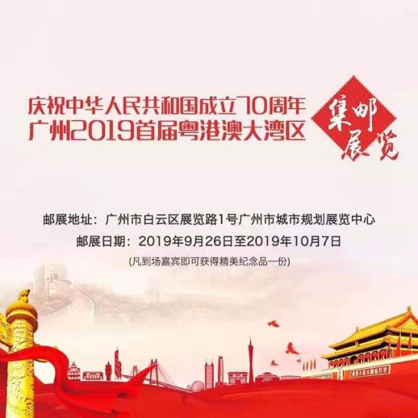 为庆祝中华人民共和国成立70周年,由全国集邮联主办,广州市人民政府新闻办公室、广东省邮政分公司、广东省集邮协会及广州天河区委宣传部承办的首届粤港澳大湾区集邮展览将于9月26日至10月7日在广州举行。