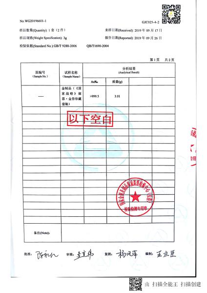 金制品(《国家战略》邮票 金券珍藏套装)检测报告