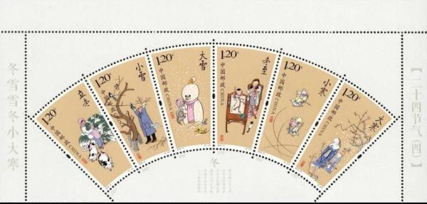 P.S. 二十四节气是我国古代根据一年中太阳在天球黄道圆上位置划分出来的24个具有时节意义的位置与日期,每个节气约15天,是中国人认知天象、物候、时令和大自然变化规律的知识体系与社会实践,是中华民族传统文化的重要组成部分。2016年,二十四节气被列入联合国教科文组织人类非物质文化遗产代表作名录。本套邮票为自2015年开始发行的《二十四节气》系列邮票第四组,表现冬天的六个节气。经过了春天的草长莺飞、桃红柳绿,夏天的阳光灿烂、浓荫匝地,秋天的金风送爽、硕果累累,便迎来了飞雪凝霜、寒风刺骨的冬天。这六个节气分别是:立冬、小雪、大雪、冬至、小寒、大寒。