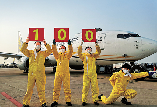 3月21日,邮航CF9016航班于7点19分飞抵武汉天河机场,飞行员在机场摆起pose,庆祝中国邮政航空执飞疫区航班100架次这一荣耀时刻。