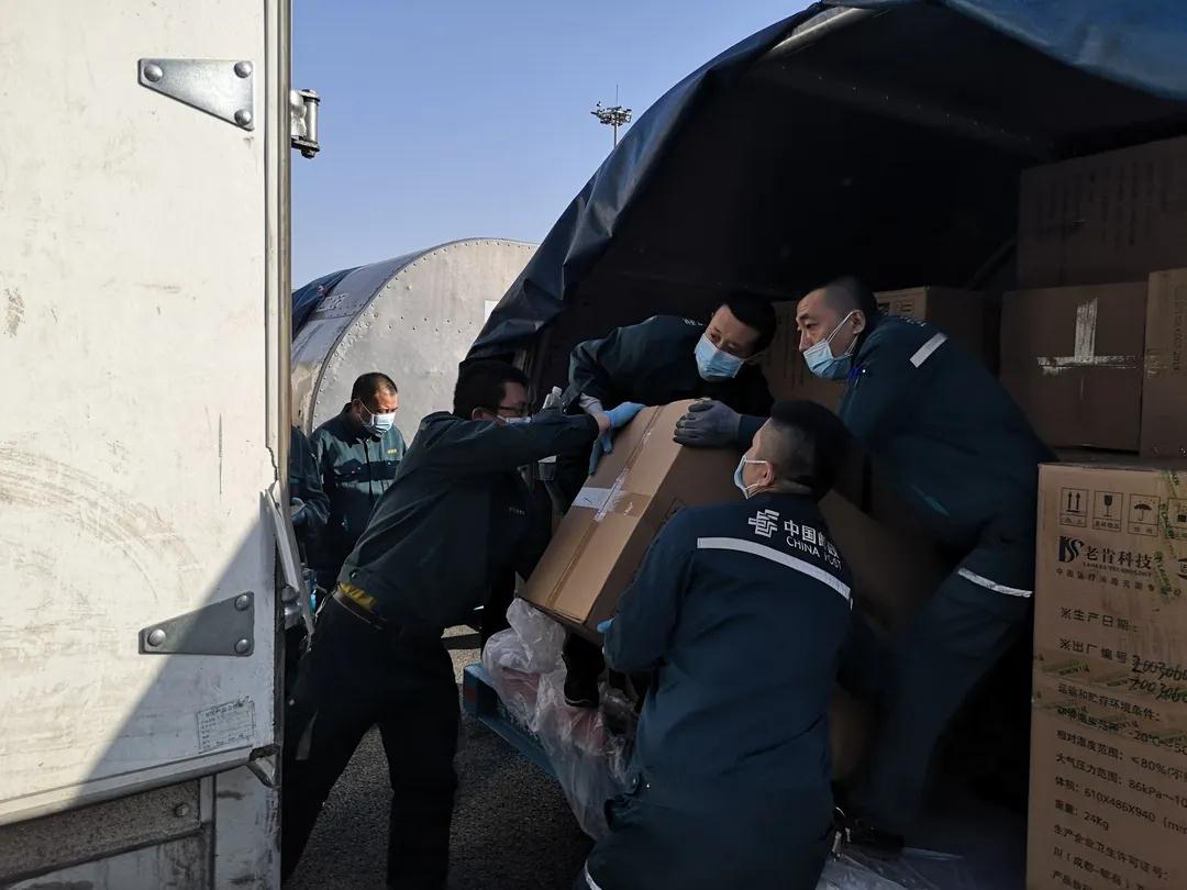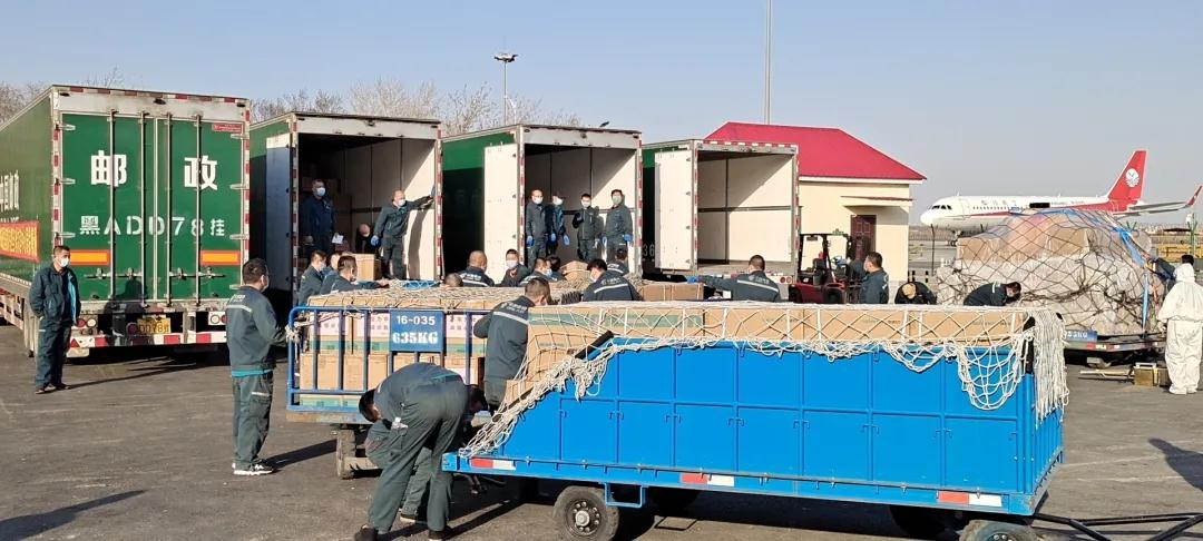 哈尔滨邮区中心局员工将邮航包机运抵的医用物资进行装车。