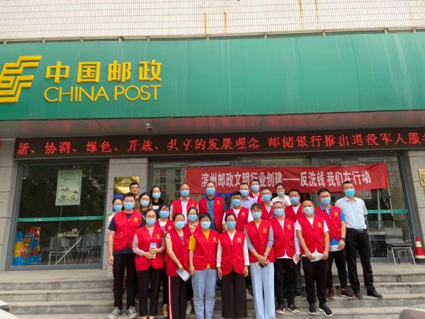 为提高市民反洗钱意识、风险识别和防范能力,滨州市邮政分公司于6月5日在前线支局,通过悬挂条幅、发放宣传彩页、现场答疑等形式,组织开展了“反洗钱,邮政在行动!”文明创建活动。