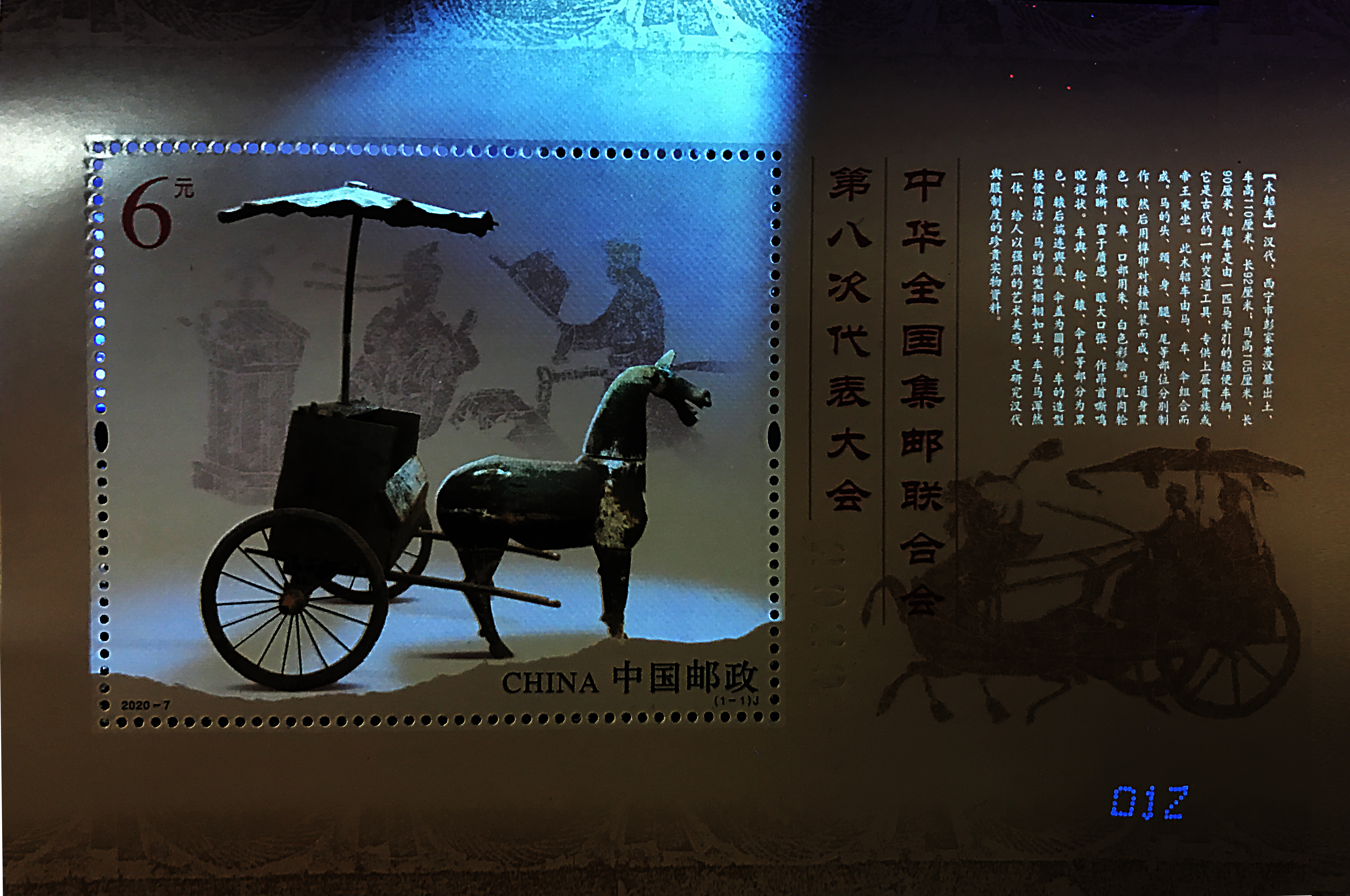 该套邮票由马立航设计,北京邮票厂影胶套印工艺印制。在印刷方面突破常规,把平凡的技术,做到极致。采用影写和胶版套印的方式,实现了传统印制工艺的组合创新。同时,在紫外光下营造出博物馆内的观赏效果,光线汇聚木轺车,明暗交错,仿佛穿越千年历史。票面上“2020”的印记,记载下集邮联八大召开的特殊年份。