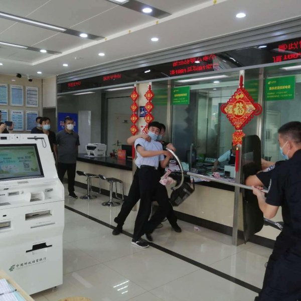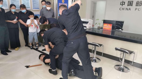 防抢劫演练模拟了犯罪分子在邮政营业厅实行抢劫的场景。演练时,面对突发事件,东港秦楼邮政支局营业员与安保人员按照预案角色分工沉着应对,及时隐蔽,伺机报警,在保证人员和财产安全的前提下与歹徒周旋,最终等到押运大队前来制服歹徒。整个演练过程分工明确,急而不乱,处置果断,达到了演练目的。