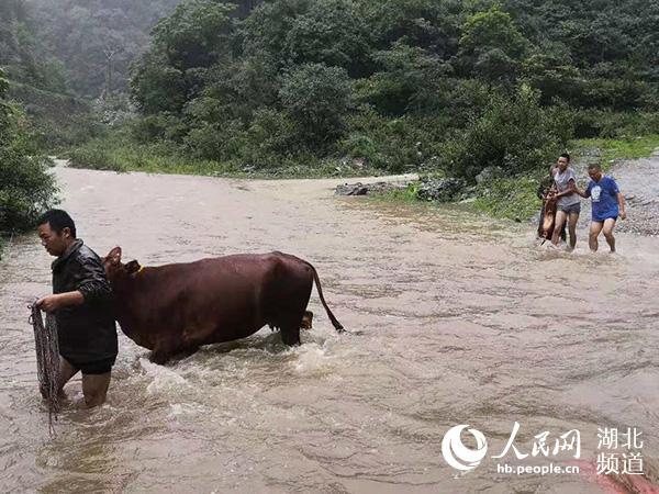 正值中午一点半,在村值班的村干部和邮储银行驻村工作队员接到求助电话后,迅速带着绳子赶往安置点山脚下。驻村工作队员赵璐、张正波冒着大雨,趟过河水,帮助贫困户将大牛赶过河、小牛抬过河,保障了其财产安全。
